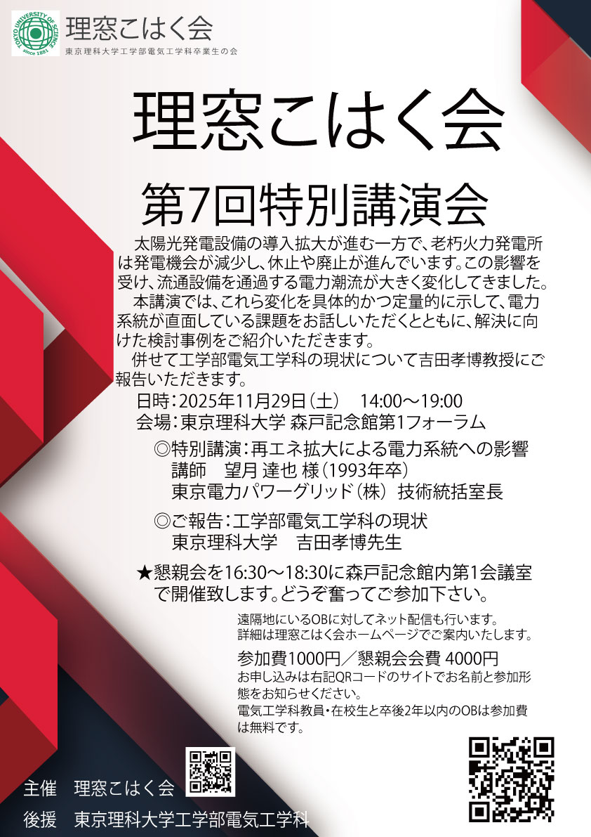 太陽光発電設備の導入拡大が進む一方で、老朽火力発電所は発電機会が減少し、休止や廃止が進んでいます。この影響を受け、流通設備を通過する電力潮流が大きく変化してきました。本特別講演では、これら変化を具体的かつ定量的に示して、電力系統が直面している課題をお話しいただくとともに、解決に向けた検討事例を望月達也様(東京電力パワーグリッド株式会社:1993年卒)にご紹介いただきます。